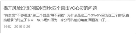 如揭開風(fēng)險(xiǎn)投資的高冷面紗:四個直擊VC心靈的問題 (如下圖 )—文中,作者將風(fēng)險(xiǎn)投資行業(yè)的一些信息進(jìn)行拆解,并向讀者和盤托出,這種"泄密"抓住了讀者內(nèi)心想要了解更多真相的愿望,起到了強(qiáng)大的吸引作用。