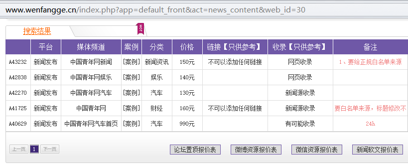 友情提醒:如果以上資源還不能滿足您的需求,請聯(lián)系文芳閣傳媒的客服人員,索取更多的包百度新聞源的媒體資源。文芳閣是國內(nèi)最早的新聞稿發(fā)布服務(wù)商之一,目前向超過萬家以上的企業(yè)提供一站式在線新聞傳播解決方案。服務(wù)內(nèi)容包括新聞稿在線發(fā)布、新聞軟文寫作、百度問答營銷、微信公眾號推廣、新浪/騰訊微博推廣、論壇發(fā)布置頂加精等。文芳閣整合了各行業(yè)的媒體資源,可為客戶提供全方面的新聞傳播和服務(wù)。